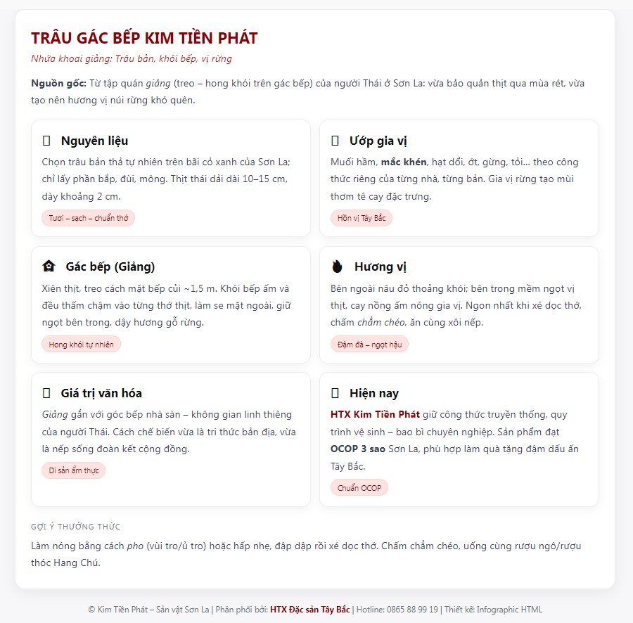 Thịt trâu Gác Bếp Kim Tiền Phát — nơi khói bếp rừng hòa cùng hương vị núi non đã đạt tiêu chuẩn OCOP 3 sao tỉnh Sơn La, trở thành một sản vật đặc sản không chỉ để thưởng thức, mà để nhớ quê hương, đồng vọng trong hơi ấm bản làng.